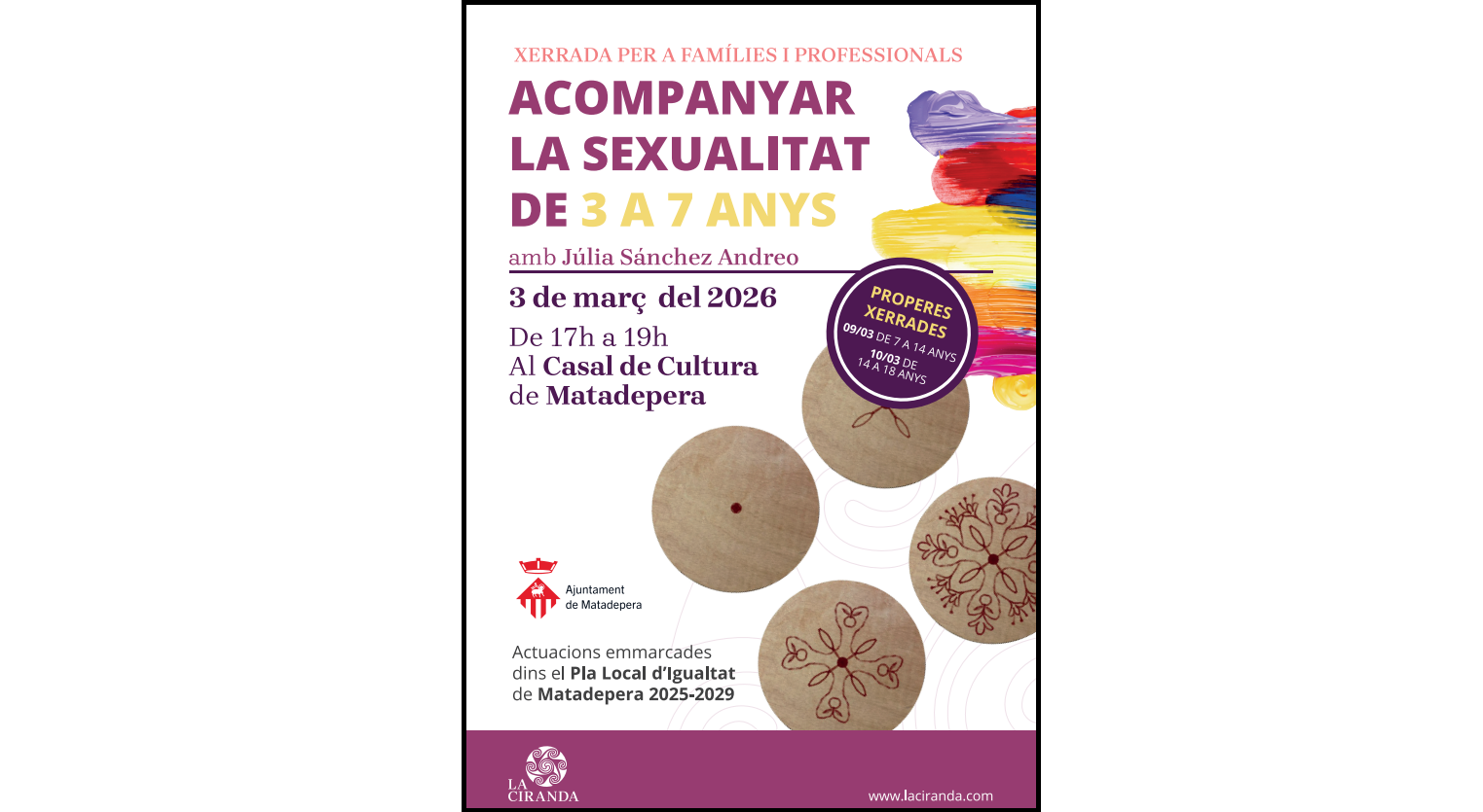 La segona d’elles tindrà lloc el 3 de març, entre les 5 i les 7 de la tarda, està adreçada a famílies i educadors que tenen cura d’infants d’entre 3 i 7 anys i porta per nom “Acompanyar la sexualitat a la infància”.