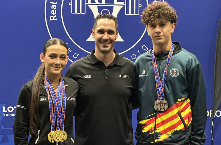 A les imatges, els dos esportistes del Club Halterofília Matadepera amb el seu entrenador, director tècnic de la Federació Catalana d'Halterofília, Òscar Gómez Medina.