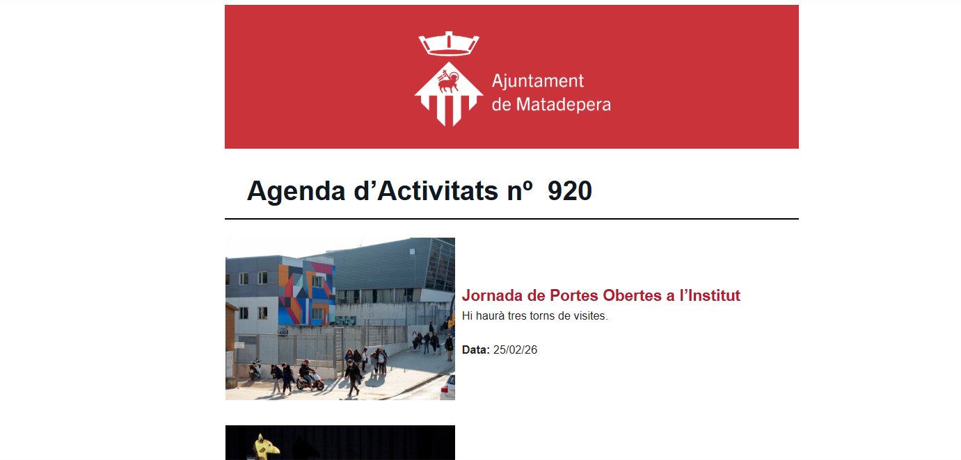 L’Agenda d’Activitats de Matadepera, el servei que recull de les principals activitats previstes al poble per a la setmana en curs i que s'envia gratuïtament als usuaris, compta amb 809 usuaris. Representen un centenar menys de quan es va iniciar la nova pàgina web, que es va posar en marxa el desembre de 2024 perquè es van haver de confirmar, per temes de protecció de dades, els correus electrònics que s'enviaven individualment.