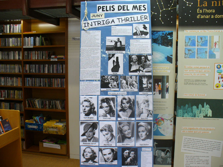 La Biblioteca Àngel Guimerà continua aquest mes de juny el cicle de monogràfics que va iniciar el gener i que aquest 2012 es consagra als "Gèneres del Cinema". Després de la Comèdia, el Musical, el Drama, la Novel·la Negra i l'Aventura, aquest mes es dedica a la intriga i el suspens. Com d'altres mesos, es posaran a disposició dels lectors algunes de les mostres més rellevants de llibres i pel·lícules. Al fulletó editat, que es pot trobar a la mateixa biblioteca, i que us podeu descarregar a la dreta d'aquesta mateixa pàgina, s'expliquen les constants del gènere, es fa un breu repàs de la seva història i s'estableix una classificació, partint de la premisa que va ser el director anglès Alfred Hitchcock el que va crear les línies fonamentals del gènere.
