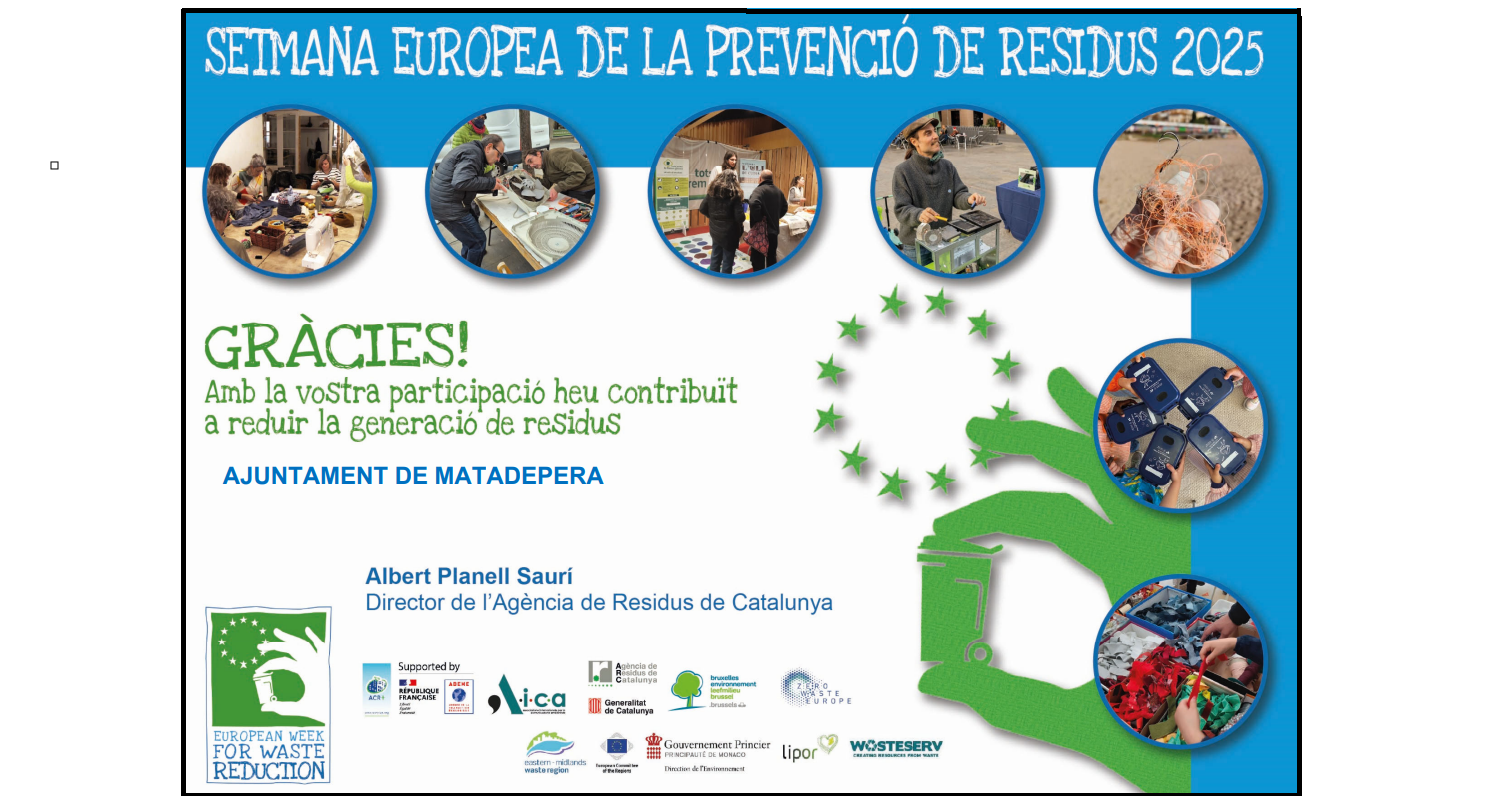 L’Agència de Residus de Catalunya, amb seu director Albert Planell al capdavant, ha agraït la labor de l’Ajuntament de Matadepera en la participació de la Setmana Europea de Prevenció de Residus que va tenir lloc el passat mes novembre. I ho ha fet amb un diploma on s’expressa l’agraïment “per haver contribuït a reduir la generació de residus”.