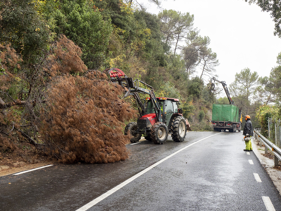 A les imatges, la tala d’uns quants arbres a la carretera, a l'alçada de Can Torrella, aquest passat dimarts (Fotos: Miquel Badia).