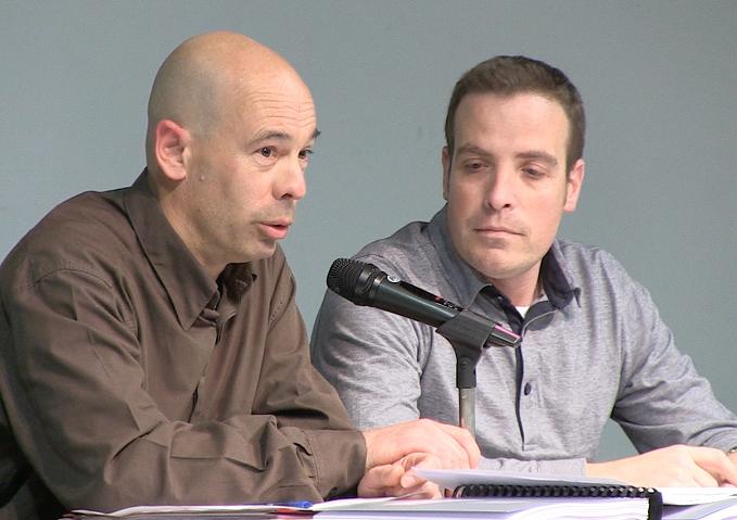 Matadepera.cat, i per això convocarem una reunió amb les entitats del poble el dilluns 31 de març per tal d’establir llaços de col·laboració amb la societat civil de Matadepera. Es dóna la circumstància que Toti Garcia és el tercer membre d’una mateixa família escollit president, ja que el seu pare , Antonio Garcia, “Pinturet” ho va ser des del 1974 al 1976; i en Joan Garcia, el seu germà, del 2008 al 2012. Aquest fet no vol que sigui un impediment per tal que l’entitat s’obri més al poble: “la idea és que hi hagi una actuació conjunta de la gent que formarem la Junta, no només per part de presidència”, ha declarat. El ja expresident Roger González ha declarat sentir-se “molt content” pel nou relleu, i ha agraït al nou president “l’empenta i la il·lusió que s’hi ha dipositat per tal que l’entitat tingui molt impuls”. A la dreta, dos moments de l’assemblea de la Junta d’aquest dilluns: a dalt, Roger González i Xavi Hernández fent balanç de la seva gestió. A sota, Toti Garcia encaixant la mà a Roger González (Fotos: Matadepera Televisió i Quico Sala).